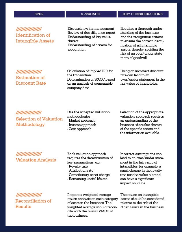 Companies should ensure they go through a robust identification and valuation process to make certain that the fair value of the intangible assets are accurately reflected in the financial statements and that the remaining useful life assigned to each category of asset reflects its nature and importance to the business. Set out below is a high level overview of the key steps in the identification and valuation of intangible assets, together with the key considerations for companies at each step of the process.